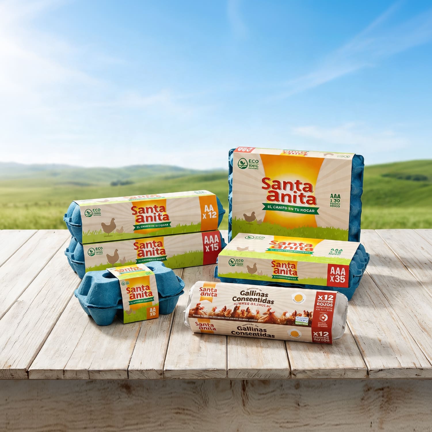 Contamos con cinco líneas de producto: Santa Anita El Campo en tu Hogar – Santa Anita VitaOmega – Gallinas Consentidas Libres de Jaula – Santa Anita Hogareños. Todas nuestras líneas tienen en diferentes puntos visibles la cantidad de huevos que contienen, también encontraras el tipo de huevo, peso neto, logo de marca, recomendación de la Fundación Colombiana del Corazón, instrucciones de uso, conservación y fecha de vencimiento.